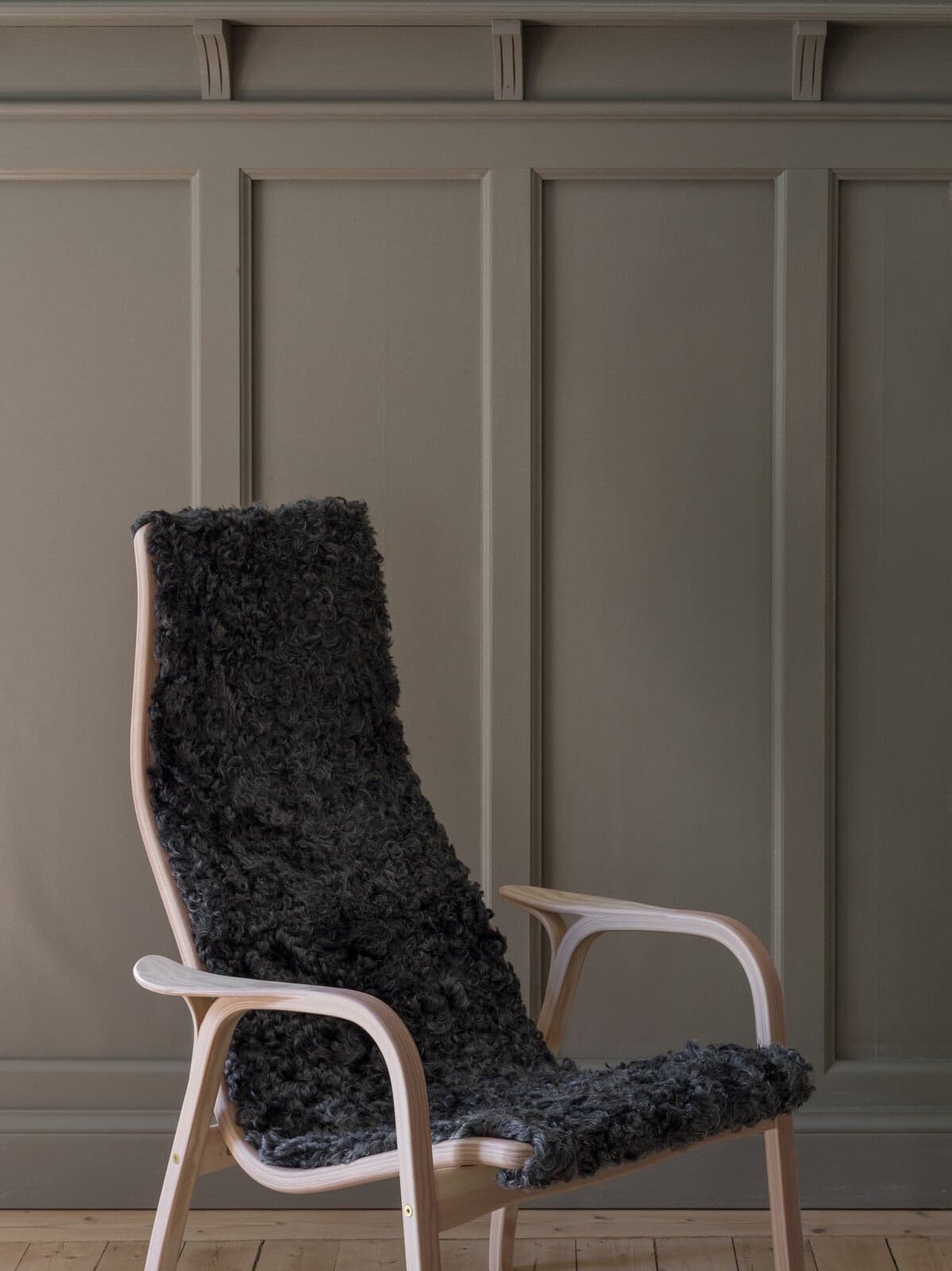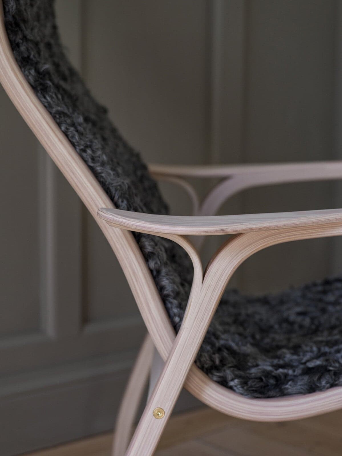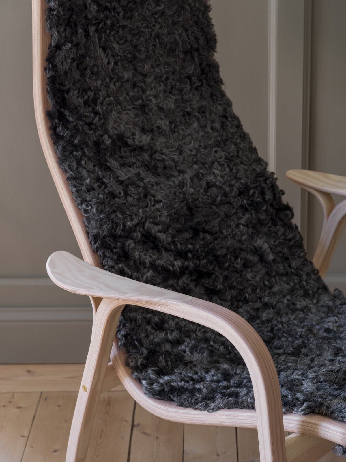 For the first time, pinewood is pressed and bent into the iconic curve that Yngve spent years perfecting. The seat is upholstered with soft sheepskin. The result is a beloved classic with beautiful contrasts, where the dark sheepskin meets light, white-pigmented pinewood.