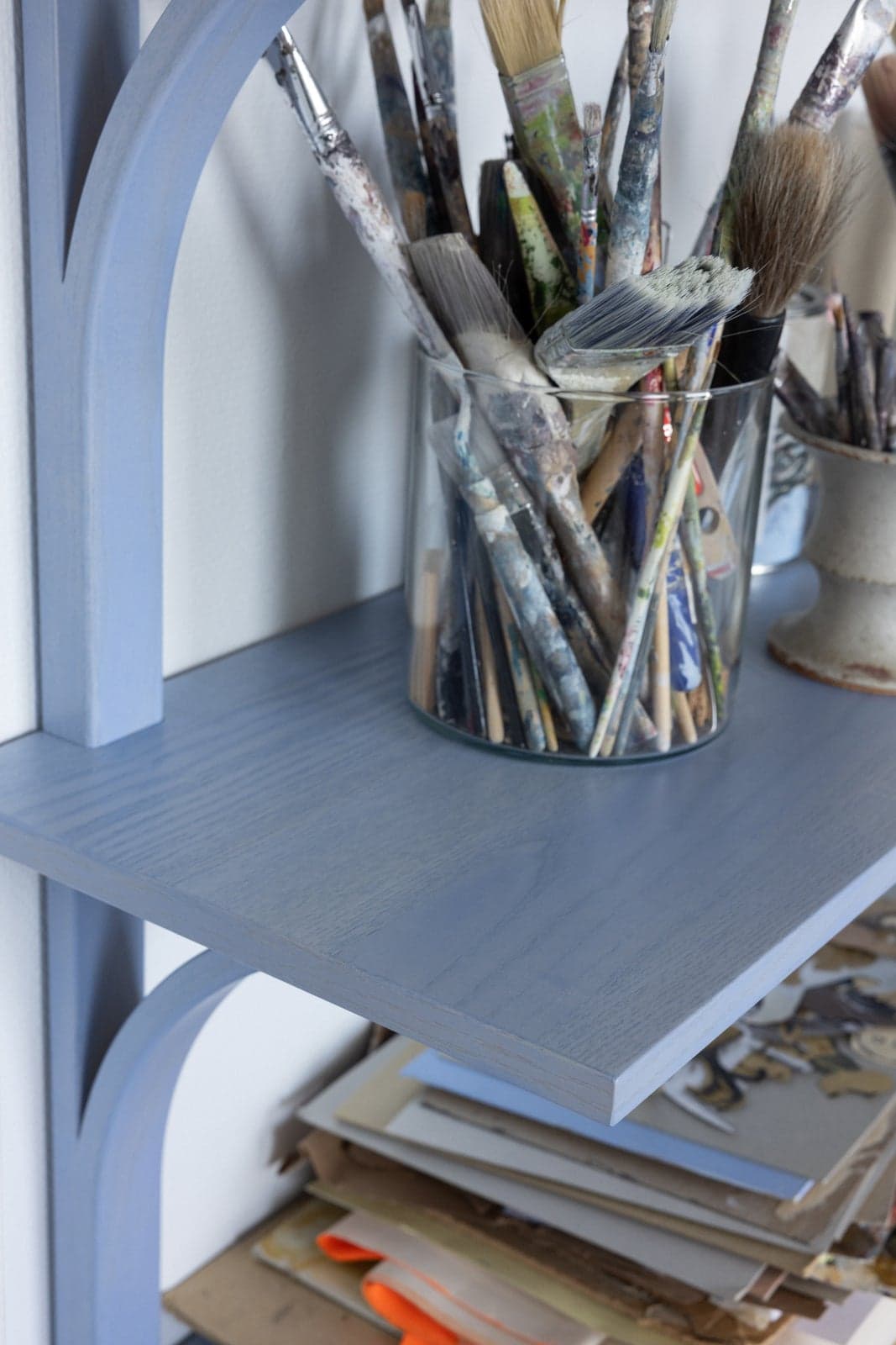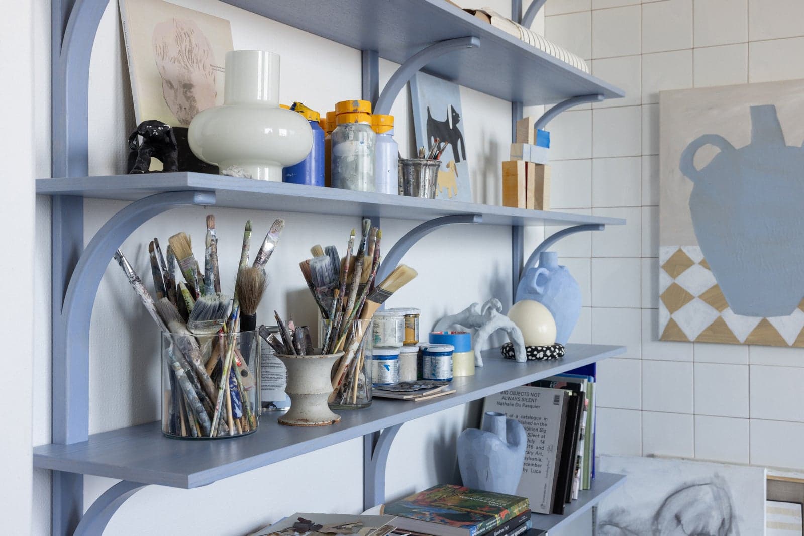 Emilia Ilkes studio i Beckers gamla färgfabrik i Liljeholmen, Stockholm är ett eget universum. De slitna gamla industriväggarna har smyckats med tavlor föreställande guldfiskar och urnor. Emilia går omkring i badtofflor på det färgfläckade golvet och flyttar in saker i sin nya hylla Levi, betsad i en ljust blå ton som låter träets ådringar lysa igenom.