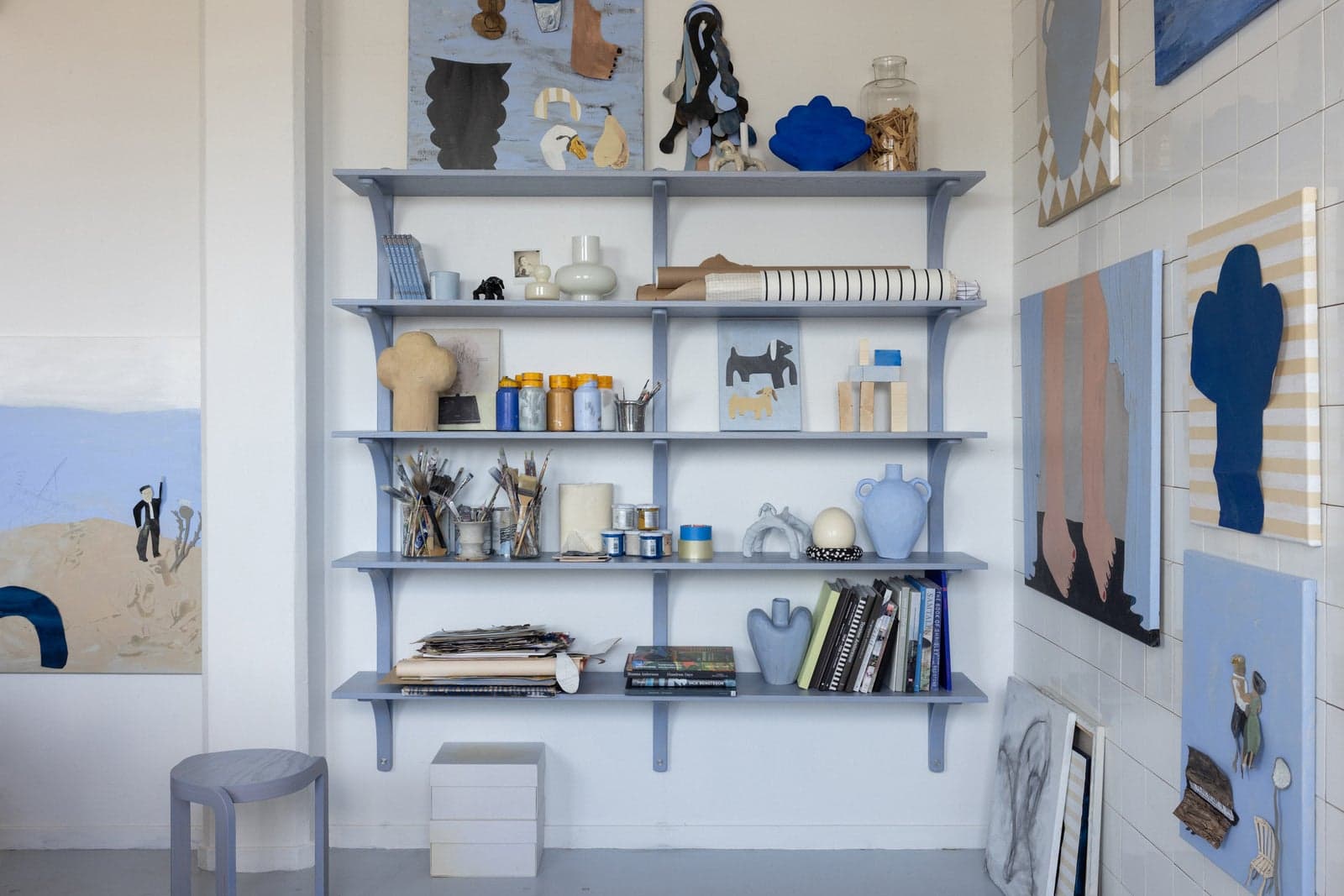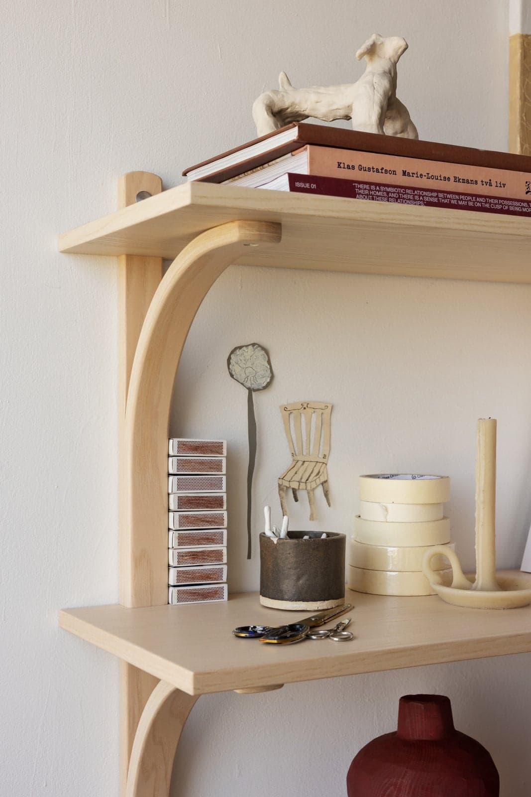 Runda metallbeslag döljer skruvarna i väggmonteringen och blir en elegant detalj. De öppna gavlarna gör det enkelt att dekorera Levi och visa upp sina favoritsaker. I Andreas egen hylla får böcker gärna sällskap av skulpturer och växter.