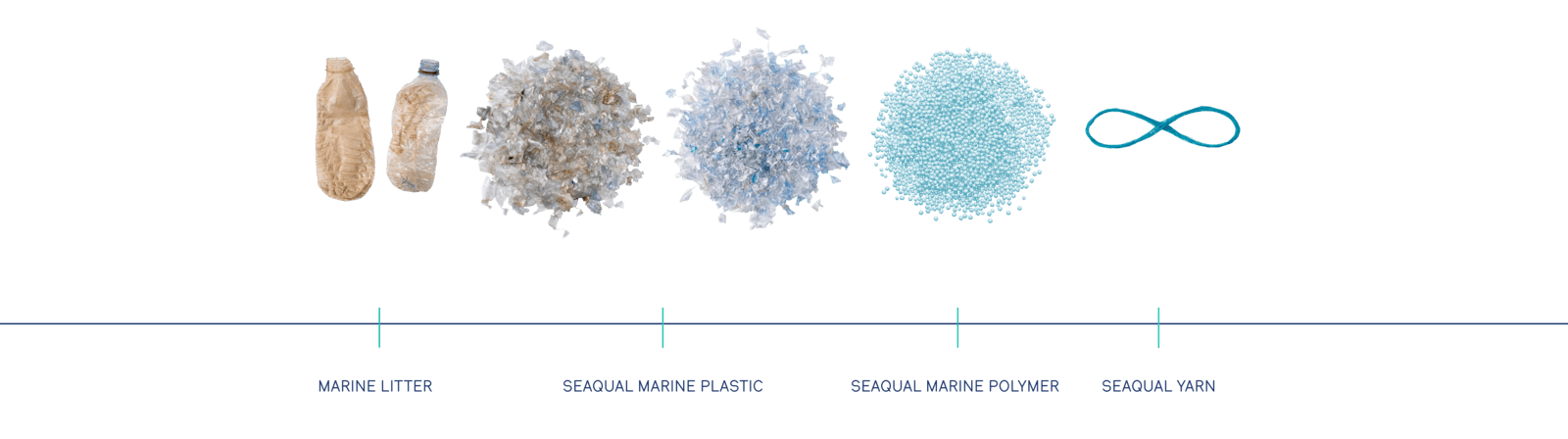 Den lilla tygbiten har en spännande historia bakom sig. Den är stickad av garnet SEAQUAL® YARN som består av 100 procent återvunnen plast. 10 procent av plasten har fiskats upp ur havet av Seaqual Initiative som samarbetar med ideella organisationer, fiskare, samhällen, myndigheter och industrier för att rena våra hav från marin nedskräpning. Resterande 90 procent kommer från återvunnen PET. För att skapa polyestertrådana i garnet strimlas plastavfallet i små bitar, tvättas, hettas upp för att till sist spinnas till tunna trådar. Garnet har sedan 3D-stickats till en unik klädsel för Mandy av Camira Knit.