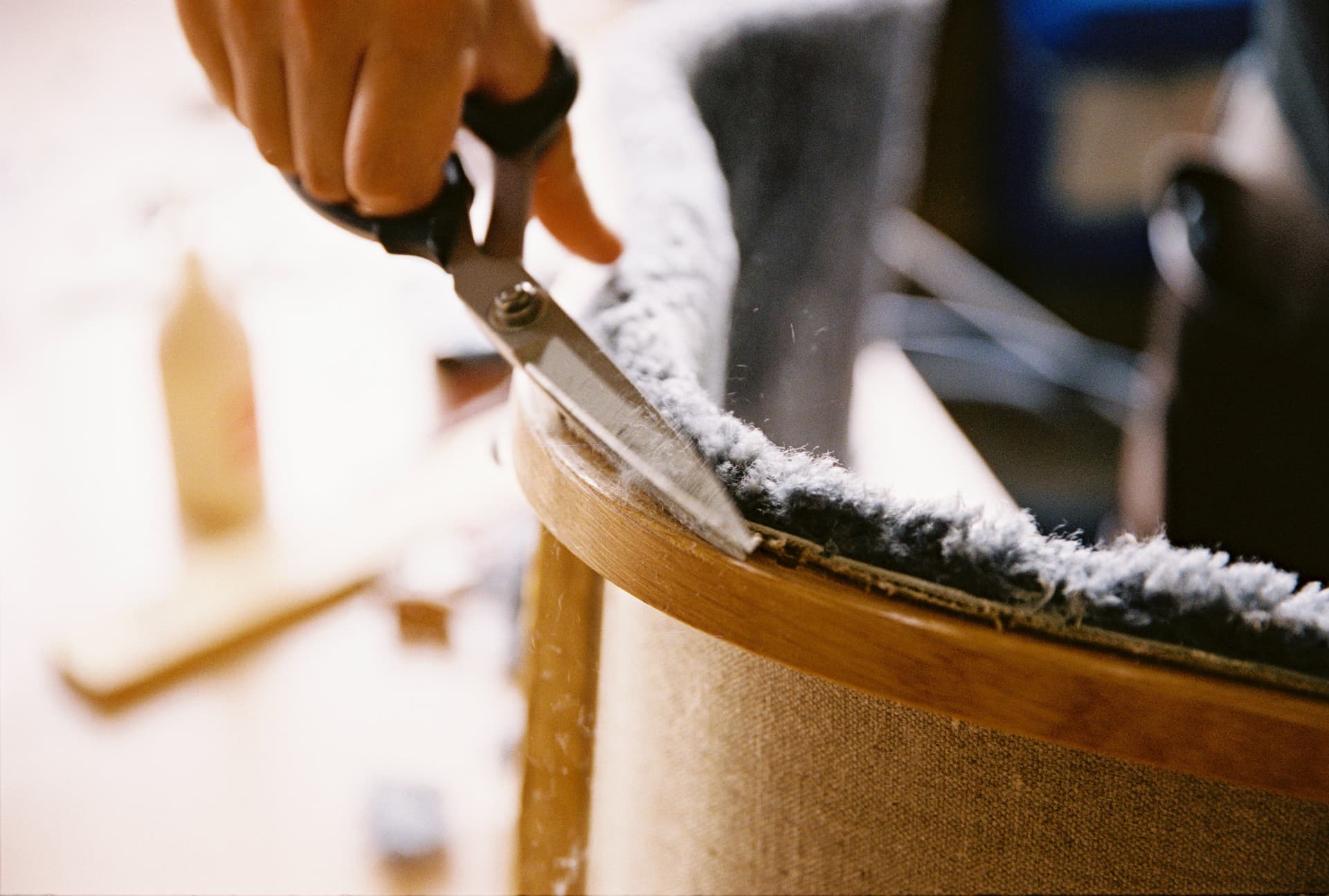 Allt börjar med att någon av våra specialister gör en besiktning av din fåtölj. Det innebär en noggrann granskning av fåtöljens behov av omsorg. Man bedömer om någon del behöver repareras eller bytas ut helt, eller om fåtöljen endast ska genomgå en föryngring genom att man renoverar ytskikt, stoppning och klädsel.